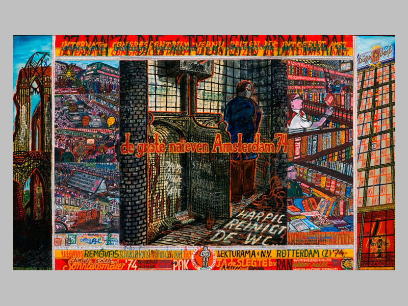 ‘In 1974 toonde het Stedelijk Museum de zogenaamde Grote Naïeven, vijf beroemde Franse naïeve schilders, waaronder Henri Rousseau en Séraphine. Daar had Willem wel bij willen of moeten hangen, vond hij, de Grote Naïef van Nederland, misschien wel groter dan die Fransen! Ze hadden toch werk van hem? Zijn woede bracht hij tot uitdrukking door zichzelf in actie in een smerig pissoir af te beelden, en naast walmende uitwerpselen op de grond met grote letters te schrijven: HARPIC REINIGT DE WC’